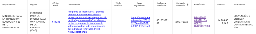 MINISTERIO PARA LA TRANSICIÓN ECOLÓGICA Y EL RETO DEMOGRÁFICO INSTITUTO PARA LA DIVERSIFICACIÓN Y AHORRO DE LA ENERGÍA (IDAE) 611288 Programa de incentivos 3: grandes demostradores de electrólisis y proyectos innovadores de producción de hidrógeno renovable” en el marco de los programas de la cadena de valor innovadora y de conocimiento del hidrógeno renovable. PRTR-NextGenerationEu https://www.boe.es/boe/dias/2021/12/24/pdfs/BOE-A-2021-21341.pdf SB133387152 24/07/2025 B44978062 CASTELLÓN GREEN HYDROGEN S.L. 14.984.431,14 € SUBVENCIÓN y ENTREGA DINERARIA SIN CONTRAPRESTACIÓN